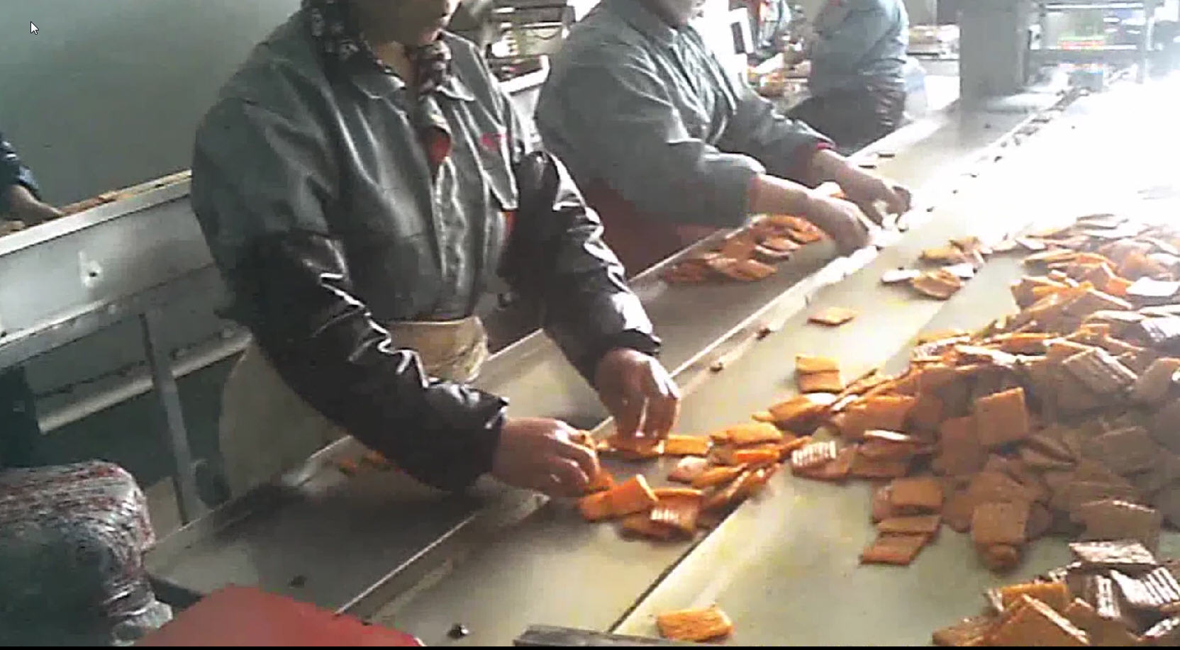 位于河南省通许县工业园的开封劲松食品有限公司生产厂房内,工人直接用手将辣条一块块装入塑料包装袋(3月7日摄 视频截图)。新华社发