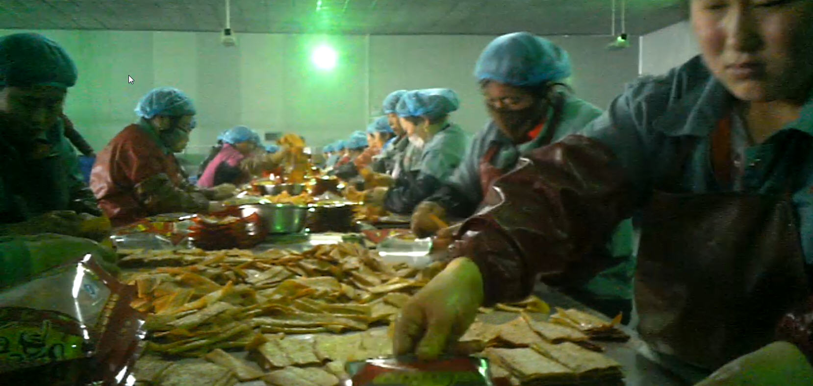 包装车间内充斥着呛人的辣条气味,记者被熏得直流眼泪。近百名女工正在这里进行封装,令人吃惊的是,那些刚刚上完厕所的女工连手都没洗就径直回到工位上。几乎没有人佩戴口罩和手套,都是直接用手将辣条一块块装入塑料包装袋。由于长时间接触辣条,双手被浸得泛着红色的油光,一些人的手指出现红肿甚至溃烂,缠着颜色各异的布条继续工作。对于记者“为什么不戴手套”的疑问,这些女工表示,戴了手套笨拙,封装慢,想多完成计件量就得徒手操作。