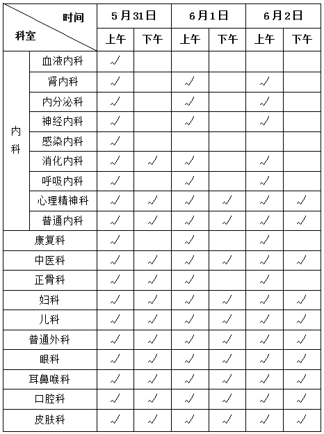 根据国家端午节放假规定,结合东川门诊部实际,5月31日、6月1日、6月2日门诊开诊安排如下(打“√”为出诊科室):