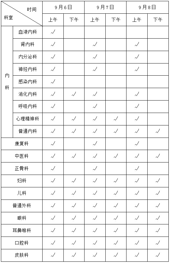 东川门诊中秋节(9月6、7、8日)开诊科室(打“√”为出诊科室)