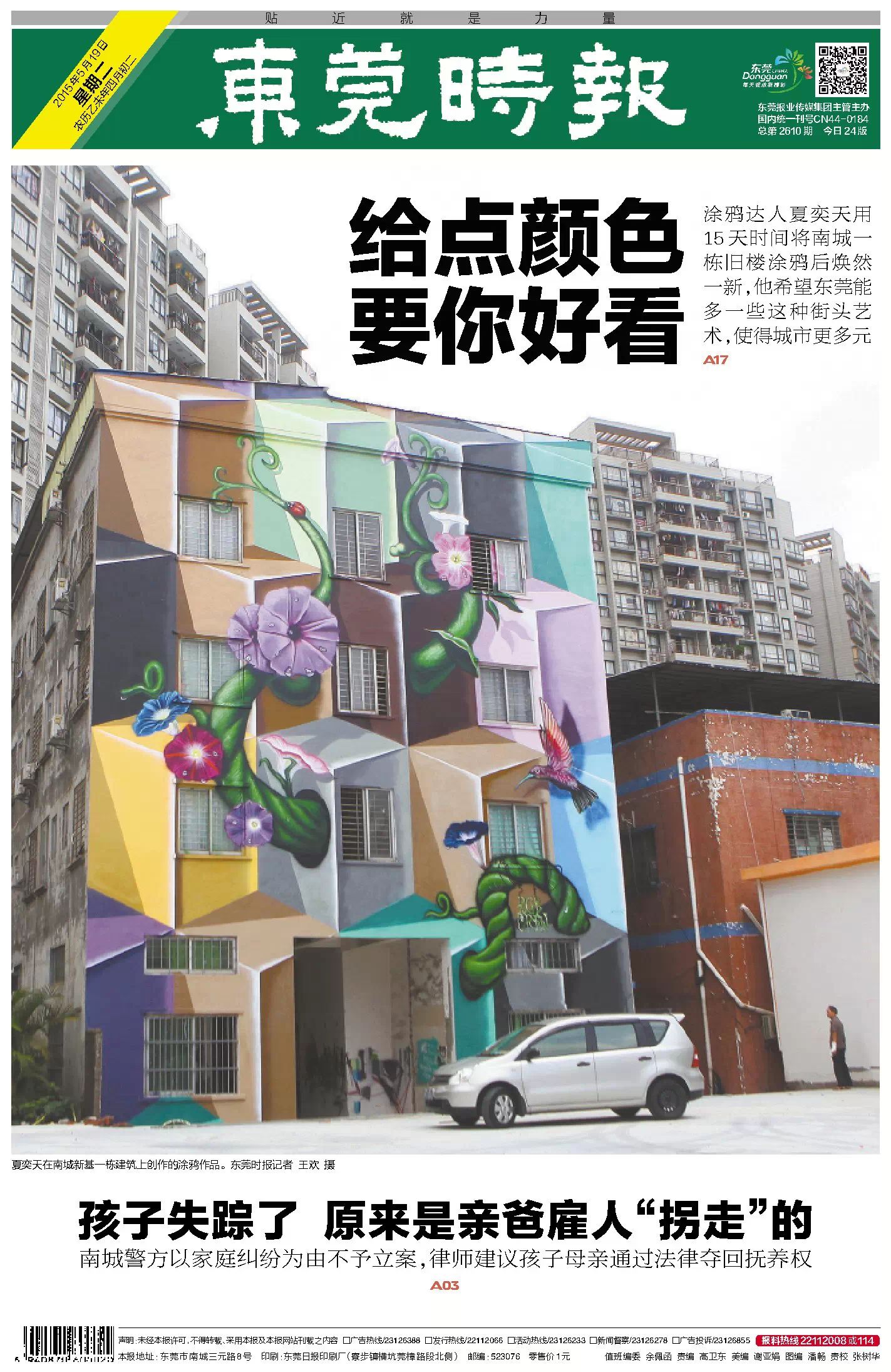 好吧,小编算是把夏奕天童鞋介绍给你认识了,他在新基的 6层楼大涂鸦 ,刚完工没多久,很适合拍照片。地址就在 南城城市风景街后面,靠近金域华府的地方。 快去看看吧,都上 东莞时报头版 了~!