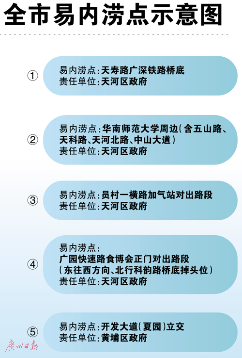 2016年5月,市水务部门首次公布26个易内涝点,其中越秀区6个,天河区10个,白云区6个,黄埔区4个。今年,水务部门公布25个易内涝点,其中越秀区2个,天河区12个,荔湾区1个,海珠区2个,白云区5个,黄埔区3个。