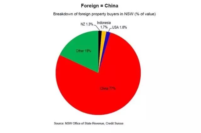 在澳大利亚,中国买房客越来越多地涌入。根据澳大利亚国外投资审查委员会的年报数据,2016年来自中国买家的住宅购买申请数量增加了19%,超过4万份,总价值达724亿澳元(约合人民币3120亿元),创下历史最高纪录。而澳大利亚广播公司ABC统计了新南威尔士州的房市数据,该州所有被海外买家购买的房产中,有高达77%(按住房价值计算)是被中国人买走的。相比之下排名第二的是印尼买家,其购买的房屋价值仅占全部海外买家的1.7%。