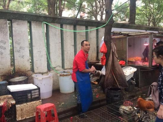 丽江花园外的肉菜市场。 丽江花园外肉菜市场宰杀活禽,摊点与小区一墙之隔。业主24小时不敢开窗