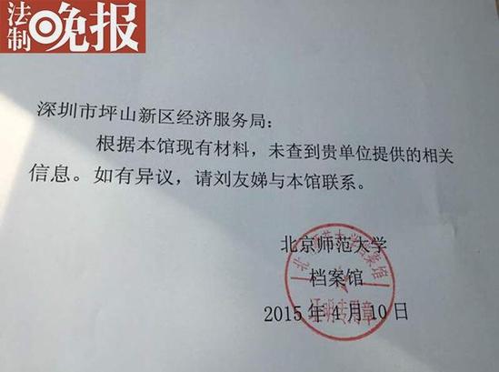 “文人应该有底线,我作为她的推荐人希望她能对我有个交代,”方元向记者坦言,自己通过坪山新区经济服务局的名义向北师大档案馆查询刘友娣的学历,但得到的回复是未能查到任何相关信息。