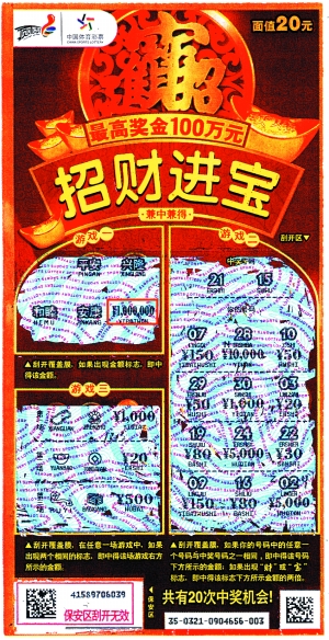 10月14日中午,小赵(化名)在花都区新华镇海关西路附近一家酒楼吃饭,饭后打算回单位上班。路上经过23280体彩投注站,以前从来未买过彩票的他突然心血来潮,想进去尝尝鲜。他问了下销售员哪些彩票好玩又容易中奖,销售员介绍了几款顶呱刮给他。最后他选了几个品种凑够100元,其中便有一张“招财进宝”。