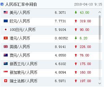 中国人民银行授权中国外汇交易中心公布,2018年4月10日银行间外汇市场人民币汇率中间价为:1美元对人民币6.3071元,1欧元对人民币7.7731元,100日元对人民币5.9104元,1港元对人民币0.80352元,1英镑对人民币8.9141元,1澳大利亚元对人民币4.8550元,1新西兰元对人民币4.6102元,1新加坡元对人民币4.8094元,1瑞士法郎对人民币6.5971元,1加拿大元对人民币4.9651元,人民币1元对0.61312林吉特,人民币1元对9.6175俄罗斯卢布, 人民币1元对1.9167南非兰特,人民币1元对169.59韩元,人民币1元对0.58231阿联酋迪拉姆,人民币1元对0.59459沙特里亚尔,人民币1元对40.0641匈牙利福林,人民币1元对0.53940波兰兹罗提,人民币1元对0.9580丹麦克朗,人民币1元对1.3250瑞典克朗,人民币1元对1.2344挪威克朗,人民币1元对0.64647土耳其里拉,人民币1元对2.9098墨西哥比索,人民币1元对4.9549泰铢。