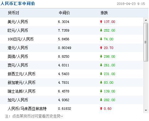中国人民银行授权中国外汇交易中心公布,2018年4月23日银行间外汇市场人民币汇率中间价为:1美元对人民币6.3034元,1欧元对人民币7.7359元,100日元对人民币5.8456元,1港元对人民币0.80349元,1英镑对人民币8.8250元,1澳大利亚元对人民币4.8311元,1新西兰元对人民币4.5403元,1新加坡元对人民币4.7831元,1瑞士法郎对人民币6.4578元,1加拿大元对人民币4.9362元,人民币1元对0.61832马来西亚林吉特,人民币1元对9.7474俄罗斯卢布,人民币1元对1.9194南非兰特,人民币1元对169.85韩元,人民币1元对0.58305阿联酋迪拉姆,人民币1元对0.59529沙特里亚尔,人民币1元对40.1650匈牙利福林,人民币1元对0.53989波兰兹罗提,人民币1元对0.9627丹麦克朗,人民币1元对1.3414瑞典克朗,人民币1元对1.2428挪威克朗,人民币1元对0.64713土耳其里拉,人民币1元对2.9412墨西哥比索,人民币1元对4.9740泰铢。