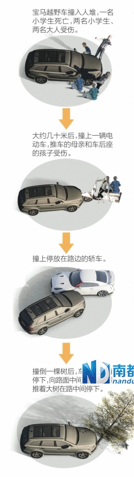 南都讯 记者张钊 通讯员 周艺 去年12月15日,一名男子驾驶一辆宝马越野车行至花都区凤凰北路时,先后撞向5名行人、一辆电动车、一辆停放 在路边的轿车及路旁树木,事故造成1名小学生死亡、3名小学生受伤,3名大人受伤。后检方以交通肇事罪指控该男子,上周五,该案在花都法院开庭,被告人对 检方的指控没有异议,称事发时自己“身体很疲倦”。案件将择日宣判。