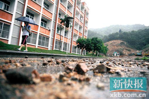 ■受持续暴雨影响,广州从化中山大学南方学院山泥倾泻,校内地面坍塌。图为学校发生山体滑坡,碎石滚落到路面。 新快报记者孙毅/摄