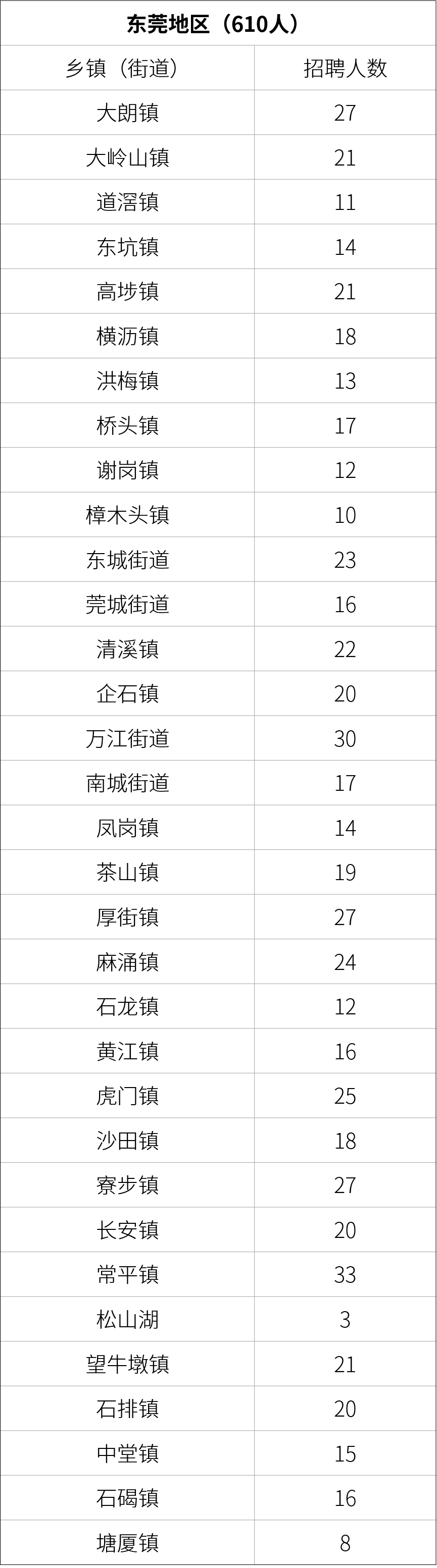 《2021年“广东兜底民生服务社会工作双百工程”乡镇(街道)社会工作服务站社工岗位信息表》显示,东莞地区33个镇街(园区)本次共招聘610人,具体分布如下:
