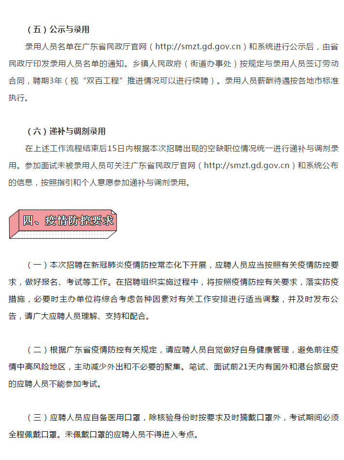 5月19日,广东民政微信公众平台发布了关于2021年公开招聘“广东兜底民生服务社会工作双百工程”乡镇(街道)社会工作服务站社工的公告。公告显示,2021年“双百工程”乡镇(街道)社会工作服务站全省计划公开招聘社工6364名,录用人员由乡镇人民政府(街道办事处)与其签订劳动合同。