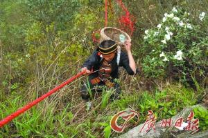 广州日报清远讯 (记者曹菁摄影报道)五一假期结束,游客打道回城,景区工作人员则要继续繁忙和辛苦。素有南粤小华山、广东第一险峰之称的广东连山金子山景区工作人员则是身怀绝技的“蜘蛛侠”与“马骝仔”,穿行在崇山峻岭与悬崖峭壁中捡游客丢下的垃圾。整个五一假期下来,他们从山上背下来上吨垃圾,平均每个人背了200公斤。