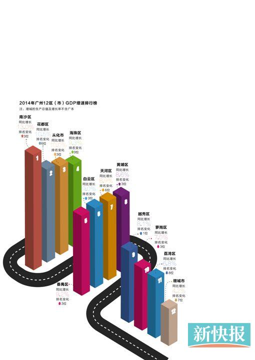 近期,广州各区市两会陆续召开,2014年12 区市的经济发展成绩单一一亮相,其中7个区市公布了今年的最新发展目标。新快报记者梳理数据发现,在地方生产总值(GDP)总量方面,全市已有8区市突破千亿元,而天河区更首破3000亿元。各区市GDP排名则较前年没有变化,不过增速排行则变化较大——天河区的增速跌了6位;南沙区登上第一,增长势头依然凌厉;增城市和荔湾区则处于倒数之列,正经历“转型之痛”……