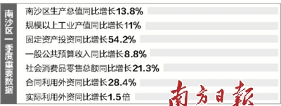 数据显示,南沙区今年一季度经济增长有不俗表现。其中规模以上工业产值同比增长11%,固定资产投资同比增长54.2%,一般公共预算收入同比增长8.8%,社会消费品零售总额同比增长21.3%,合同利用外资同比增长28.4%,实际利用外资同比增长1.5倍,出口总额同比增长37.8%。
