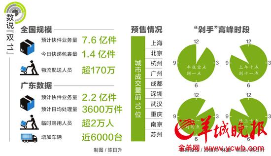 羊城晚报讯 记者吕楠芳报道:“血拼”忙,不如快递员忙。记者从广东省邮政管理局获悉,今年“双11”期间全省行业处理的邮件(快件)业务量将超过2.2亿件,比去年同期增长42.5%。