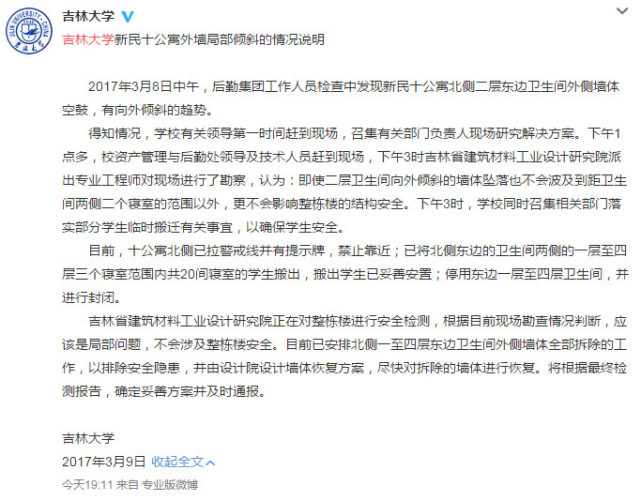 晚上19:10,吉林大学官方微博发布公告称:3月8日中午,后勤集团工作人员在检查中发现新民十公寓北侧二层东边卫生间外侧墙体空鼓,有向外倾斜的趋势。当天下午3点,吉林省建筑材料工业设计研究院派出专业工程师对现场进行了勘查,勘查表明墙体倾斜是局部问题,并不会涉及整栋楼安全。目前十公寓北侧已拉警戒线并有提示牌禁止靠近,学校已将楼体倾斜涉及到的1至4层,20间寝室的学生搬出并妥善安置,吉林省建筑材料工业设计研究院正在对整栋楼进行安全监测,已安排相关倾斜楼体的拆除工作,随后将由设计院设计墙体恢复方案。学校将根据最终监测报告,确定妥善方案并及时通报。