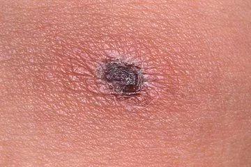 医生立即给患者进行了详细的体格检查,发现患者左髋部有一处焦痂,并判断这个是被恙虫咬伤的典型体征。
