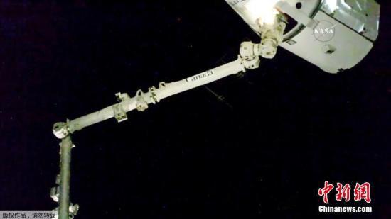 资料图片:“龙”飞船飞临国际空间站,成功被国际空间站机械臂捕获。据悉,这艘“龙”飞船4月初为国际太空站送去了补给品和设备,现在则携约2吨的科学样品归来。