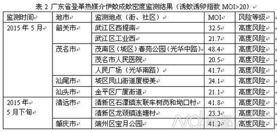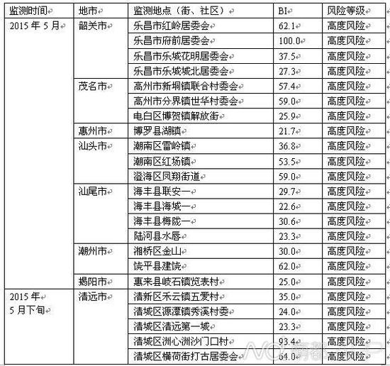 表1 广东省登革热媒介伊蚊幼虫密度监测结果(布雷图指数BI>20)