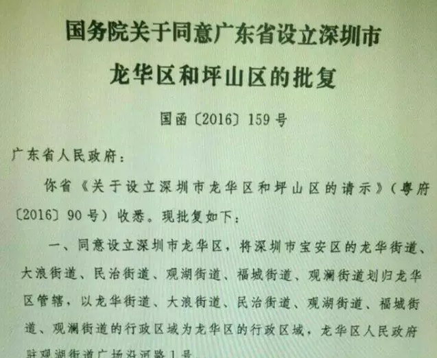 国务院批复同意设立深圳市龙华区和坪山区