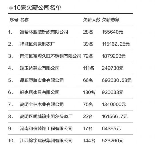 佛山人社局曝光10家欠薪公司 多的达数百万元