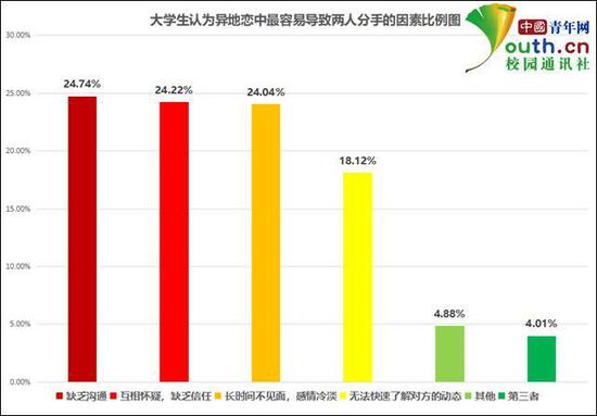 根据中国青年网记者调查显示,“缺乏沟通”“互相怀疑,缺乏信任”“长时间不见面,感情冷淡”成为异地恋中最容易导致两人分手的主要因素;这些因素在调查结果中分别所占比例为24.74%、24.22%、24.04%。