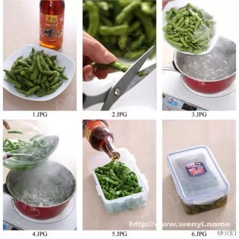 2)锅中倒入清水,沸腾后倒入剪好的毛豆,水再次开锅后,继续煮30秒钟后捞出,立即放入冷水中。此时水的温度会变高,倒出温水,再倒入新的清水,直到毛豆的温度彻底冷却下来;