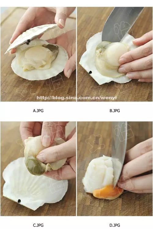 1) 将扇贝的外壳掰开(图A),用刀将扇贝肉片出(图B),去掉黑色的沙包(图C)。