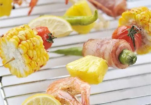 3)将各种处理好的蔬果,肉类穿成串,然后将什锦串放在烤架上,下层要垫一个铺有锡纸的烤盘,放入预热好的烤箱中,以200度烤约15分钟左右即可。