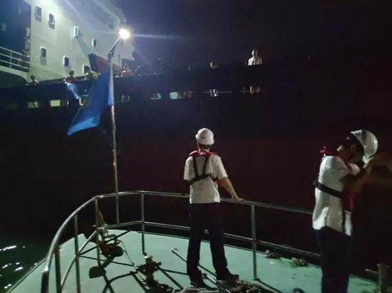 海事人员通过AIS和甚高频(VHF)等执法设备准确确定目标船舶所在位置23:46时左右,海事人员成功靠上“鑫田7号”轮,并将落水人员转移到海事趸船。