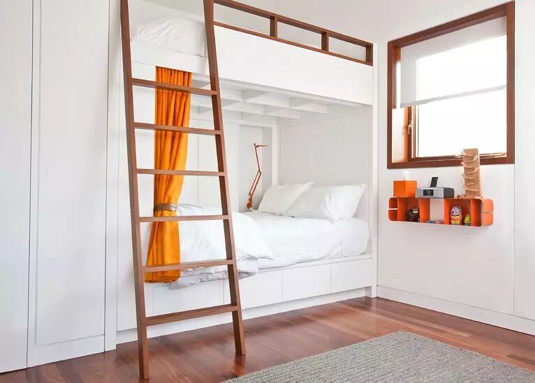 让他们看起来更加随意,因为它们占据的面积非常少,所以有多余的空间可以给你做装饰。虽然是传统上下床的框架,但是依然可以将它摆成各种造型。