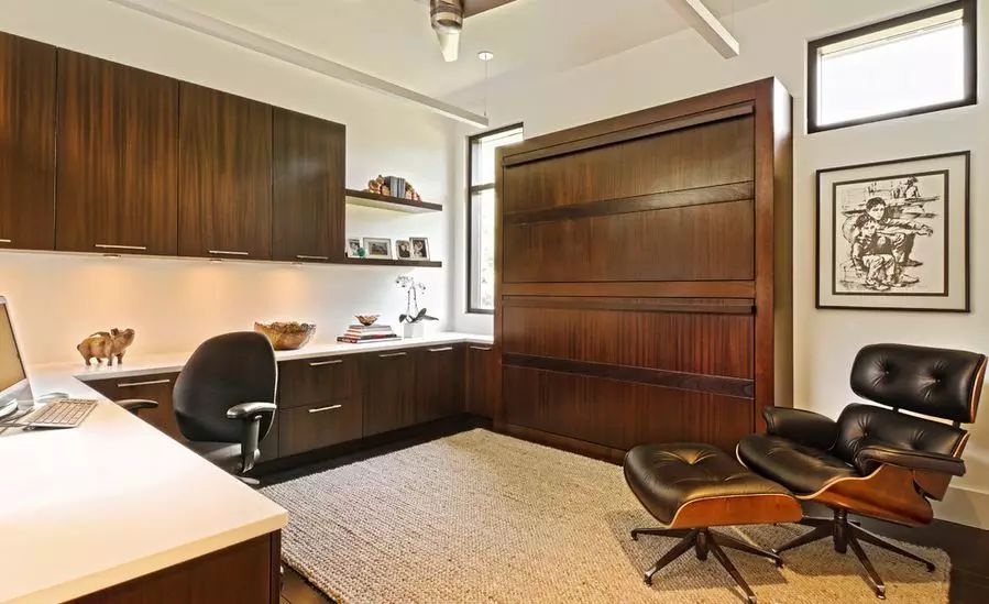 这个超级双层床设计者真是太聪明了。在不用到床的情况下就将它塞进去,完美到如同虚设,形成办公室。现今房价那么贵,制造一个这种拥有不同功能的房间简直就是省钱最好的方式。果断剁手!