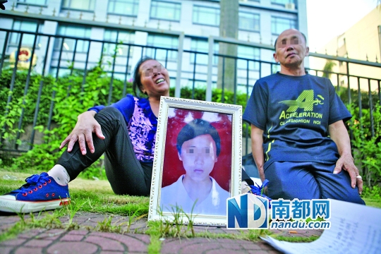 →10月9日,死者舒某的家属拿着儿子照片讨说法。南都记者 霍健斌 摄