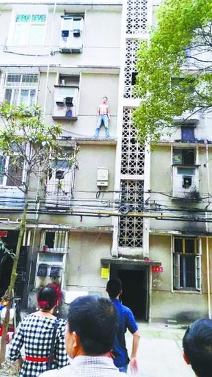 中午12点,记者赶到现场时,见一赤裸上身的男子站在三楼外墙水泥板上,冲着楼下上百号围观的民众,情绪激动地叫喊着要跳楼。