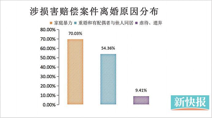 在离婚纠纷中,提起离婚诉讼的主要为女性,占63.41%。在提出精神损害赔偿请求的离婚案件中,女性占比67.52%,其中涉及到家庭暴力的占70.03%,涉及到重婚和有配偶者与他人同居的占54.36%,涉及到虐待、遗弃的占9.41%。可见,女性的自主意识不断增强,但也反映出,女性在婚姻中仍处于相对弱势地位。