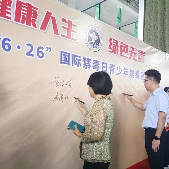 随后, 副市长、市禁毒委主任、公安局长曾湘澜和龙湖区副区长,区禁毒委主任,公安分局局长郭伟分别向林百欣科技中专赠送毒品预防教育宣传资料和授予禁毒宣教广场牌匾,希望学校充分发挥毒品预防教育主阵地的作用,护航青少年学生健康成长。全体人员还在签名墙上签下自己的姓名、许下拒绝毒品的承诺。