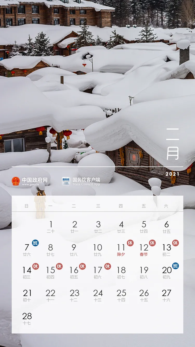 二、春节:2月11日至17日放假调休,共7天。2月7日(星期日)、2月20日(星期六)上班。