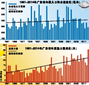 记者了解到,广东省气象局近期编制完成了《2014年广东省气候变化监测公报》。公报显示,从1961年到2014年,广东省气温总体明显升高,年平均气温每10年升高0.17℃,其中粤东地区增温速率最大,平均每10年升高0.24℃。而年暴雨日数也呈上升趋势。