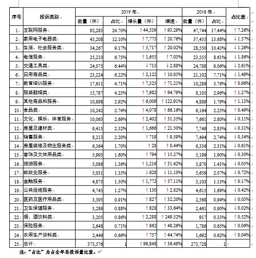 表1:2019年消费者投诉性质明细表四、个别行业拉升投诉,互联网服务问题不小