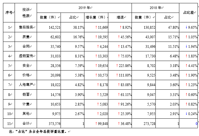 从投诉性质看,售后服务、质量和合同三类投诉位列2019年消费投诉前三位(表1)。从增速看,安全类投诉高达28356件,同比增长225.86%,排在第一位。此外,价格、计量、人格尊严、虚假宣传、假冒等投诉,均有较大幅度增长,增幅在75%以上。其中,计量投诉10653件,增速91.26%;而关于人格尊严的投诉近年稳步增长,2019年达18022件,增速83.08%,创历年新高。