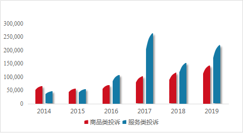 2019年,全省消委会受理商品类投诉量142993件,同比增长23.57%,占总投诉量38.28%;服务类投诉量219685件,高于商品类76692件,占总投诉量58.81%。对比近年数据(图3),2015年以前,商品类投诉量一直高于服务类投诉,自2016年开始,服务类投诉量反超商品类投诉,且两者差距不断拉大,整体呈现出投诉重心逐年向服务类投诉倾斜的趋势,反映出服务业逐渐成为消费纠纷集中的领域。