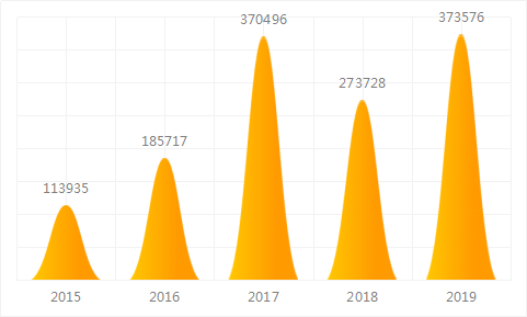 2019年,全省消委会受理投诉总量和挽回经济损失数再创新高,继续居于全国首位,其中受理消费者投诉373576件,刷新了2017年因“小鸣单车”群体性投诉创下的记录(370496件)。纵观近年来投诉总量变化情况,整体处于逐步增长态势,总体增幅较快,与2015年相比,增长已经超过3倍(图1)。