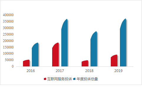 表2:2019年消费者投诉类别明细表 图4:2016-2019年互联网服务投诉量与年度投诉总量对比图 图5:2019互联网服务类投诉性质分布图第二部分 消费投诉热点难点分析