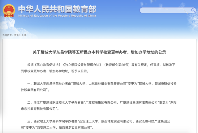 7月19日,教育部官网发布《关于聊城大学东昌学院等五所民办本科学校变更举办者、增加办学地址的公示》,公示指出,根据《民办教育促进法》《独立学院设置与管理办法》(教育部令第26号)等有关规定,经审核,拟核准五所学校变更举办者、增加办学地址,其中有两所学校位于广东。