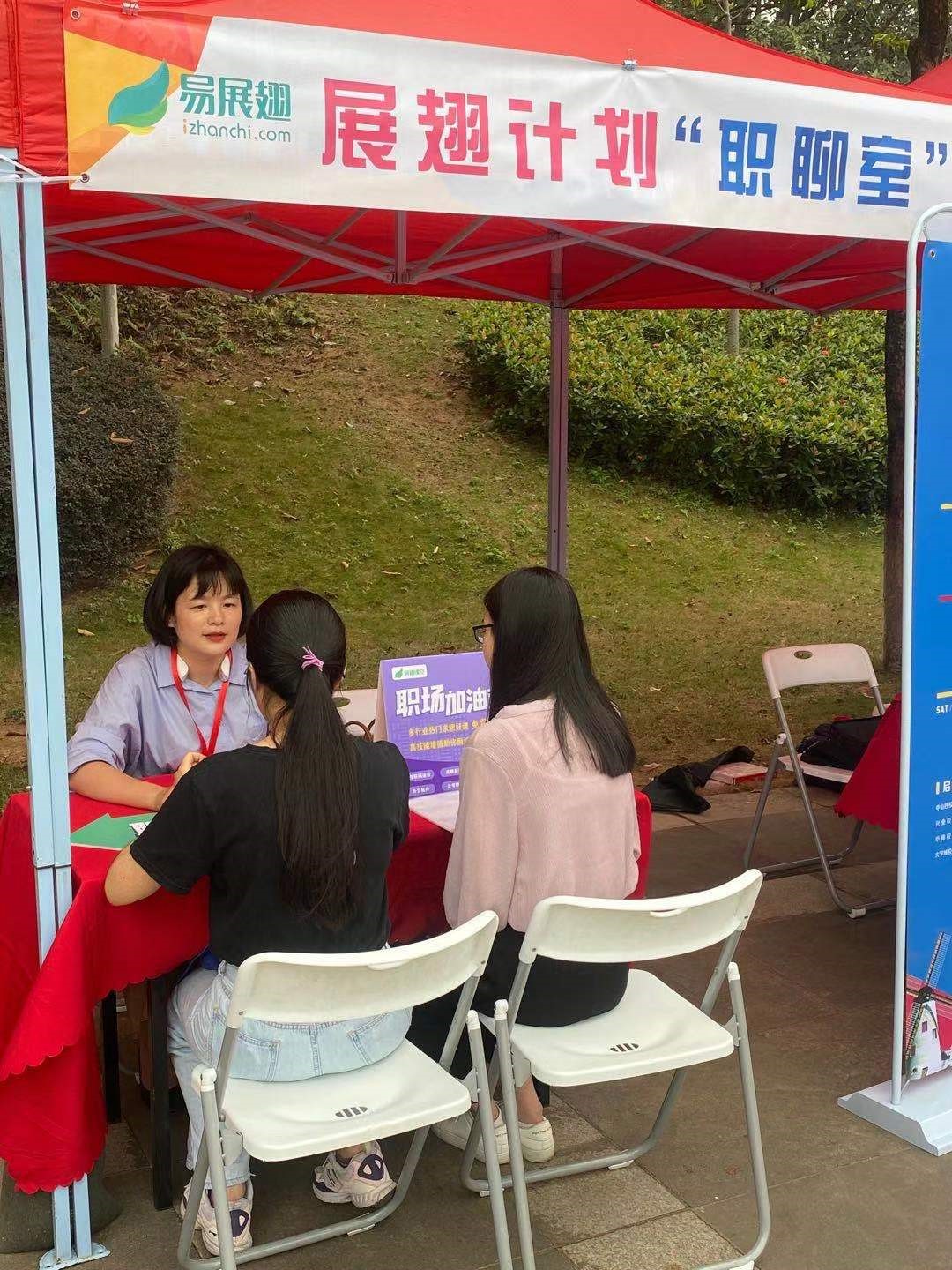 “展翅计划”职聊室展位前,学生向职业规划导师咨询就业是最大的民生。今年,“展翅计划”项目正式上线“粤省事”民生平台,在人才与就业专栏开设“找实习”“找工作”专区,为青年学生提供更加便利的就业服务。