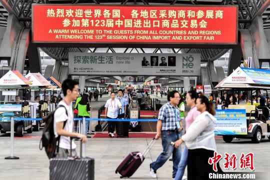 第123届广交会现场。 陈骥旻 摄本届广交会采购商到会203346人,来自214个国家和地区,增长5.3%,为5年来最高水平。各大洲到会人数全面增长,其中美洲和欧洲增长最多,分别增长12.76%、8.07%。