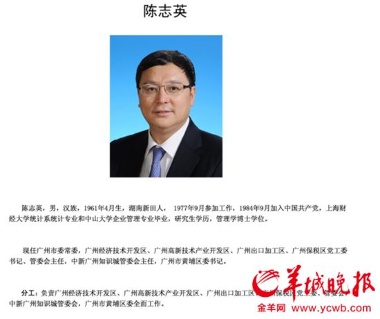 根据这份名单,广州开发区党工委领导班子由11人组成,开发区党工委书记由陈志英担任,设副书记两名,党工委委员8名。