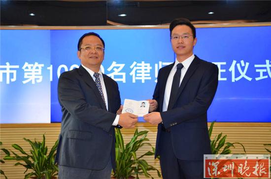 昨日,深圳市第 10000 名律师刘中祥从深圳市司法局局长蒋溪林的手中接过律师执业证,这位年仅 25 的 “ 新手 ” 正式踏上了法律服务之路。数据显示,截止目前,深圳市共有执业律师 10011 人,其中本科以上学历占总人数 98% 以上,平均年龄为 39 岁,平均每 2000 人能享受到一名职业律师服务。