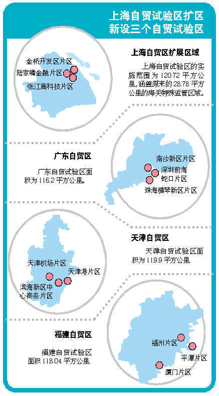 商务部部长助理王受文表示,党中央、国务院决定要进一步扩展上海自贸试验区的范围,并且在广东、天津、福建再新设三个自贸试验区,这些方案已于今日印发。